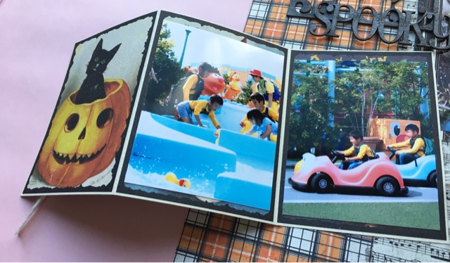 ●台紙のペーパーは、もともと片面にチェック、もう片面に楽譜の1枚のパターンペーパー。両端から3.5インチでカットしくるっと裏返し。違うペーパーを重ねたみたいに。両面どちらの絵柄も使いたい~!!というときにもするECOな使い方ですね。